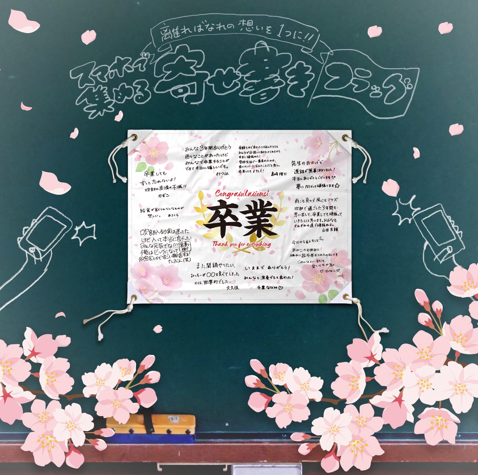 ゲーフラ工房byプリント工房 春間近 スマホで集める寄せ書き旗 記念品 遠隔からスマートフォンで集めた手書き 文字画像やメッセージを 一枚の旗に素敵にデザイン 記念写真やイラストもご希望に沿ってお入れできます 詳しくは下記よりお問い合わせ